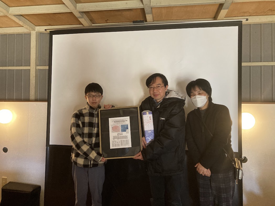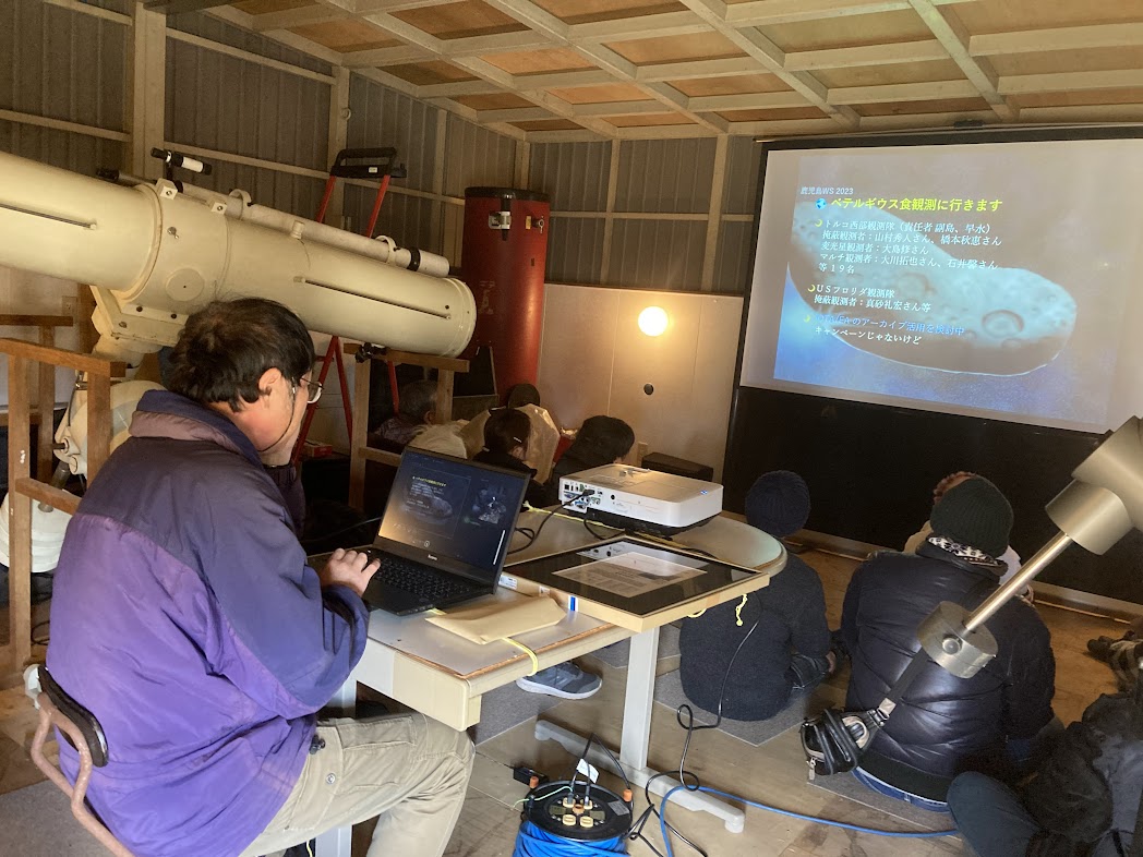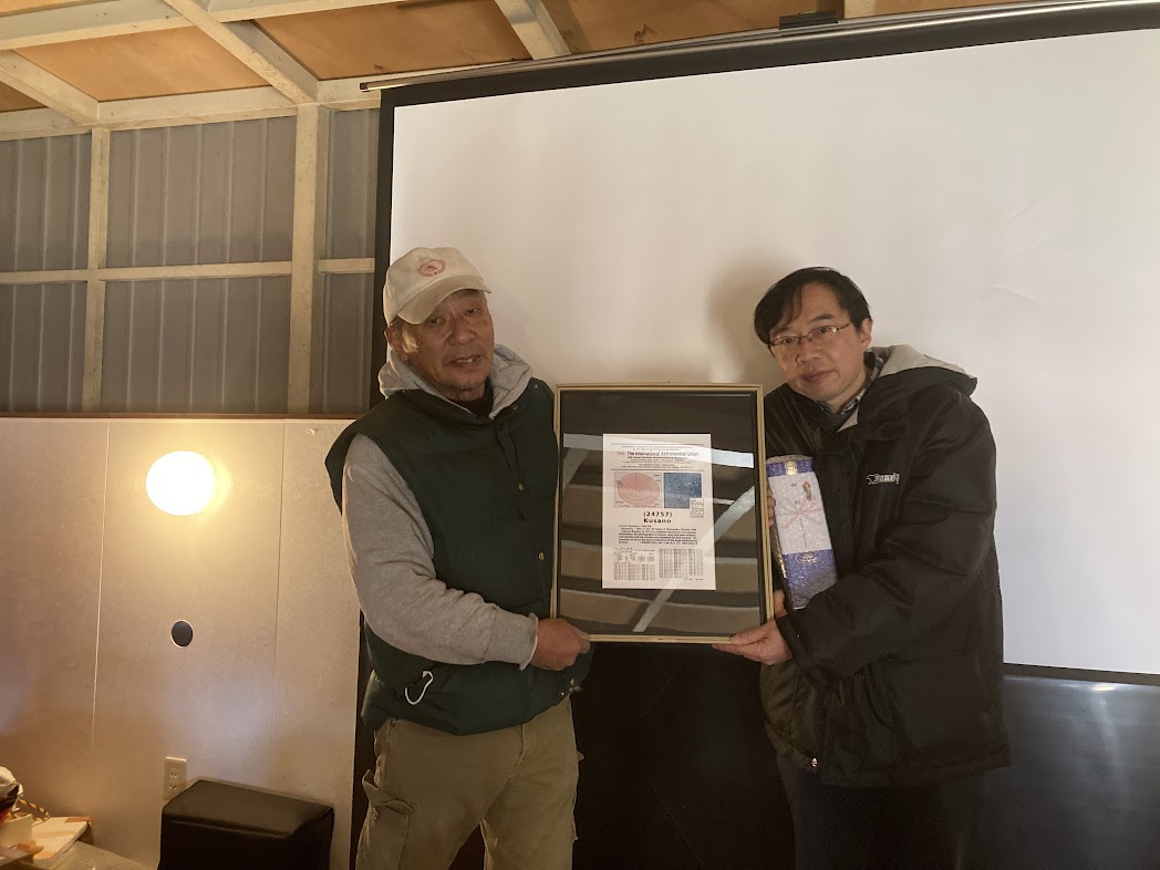 1月7日 新年会・草野氏小惑星命名記念祝賀会 19:00~ <草野氏小惑星命名記念品贈呈>13:00~13:10 草野氏の小惑星登録番号は24757、小惑星名はKusanoである 。 美しい天体写真を撮影ることや佐賀天文協会の理事である旨が小惑星のサイトで紹介されている。 佐賀天文協会からの記念品を贈呈し拍手でお祝いした。 <ベテルギウス食観測遠征報告>13:10~14:00 小惑星によるベテルギウス食を観測するため12月中旬に、副島会長と早水氏、小柳氏がトルコまで遠征した。 早水氏がその報告を行った。残念ながら、雲に阻まれてベテルギウス食の観測ができなかったとのことだが、 ギリシャ神話との繋がりが濃ゆいトルコならではの観光地の紹介を楽しく聞いた。 <新年会>14:00~17:00 2020年から4年ぶりとなる新年会を開催。 久しぶりに太良観測所で牡蠣と佐賀牛を堪能するBBQを行った。 参加者:青柳、池上、上野、大田、草野、小柳、近藤、澁谷、副島、園田、中地、中野(中澄) 永渕、早水、福田、古川、松林、宮原、他 会員家族・友人 6名、城東高校2名、計26名 <写真>1,2, 3,4, |