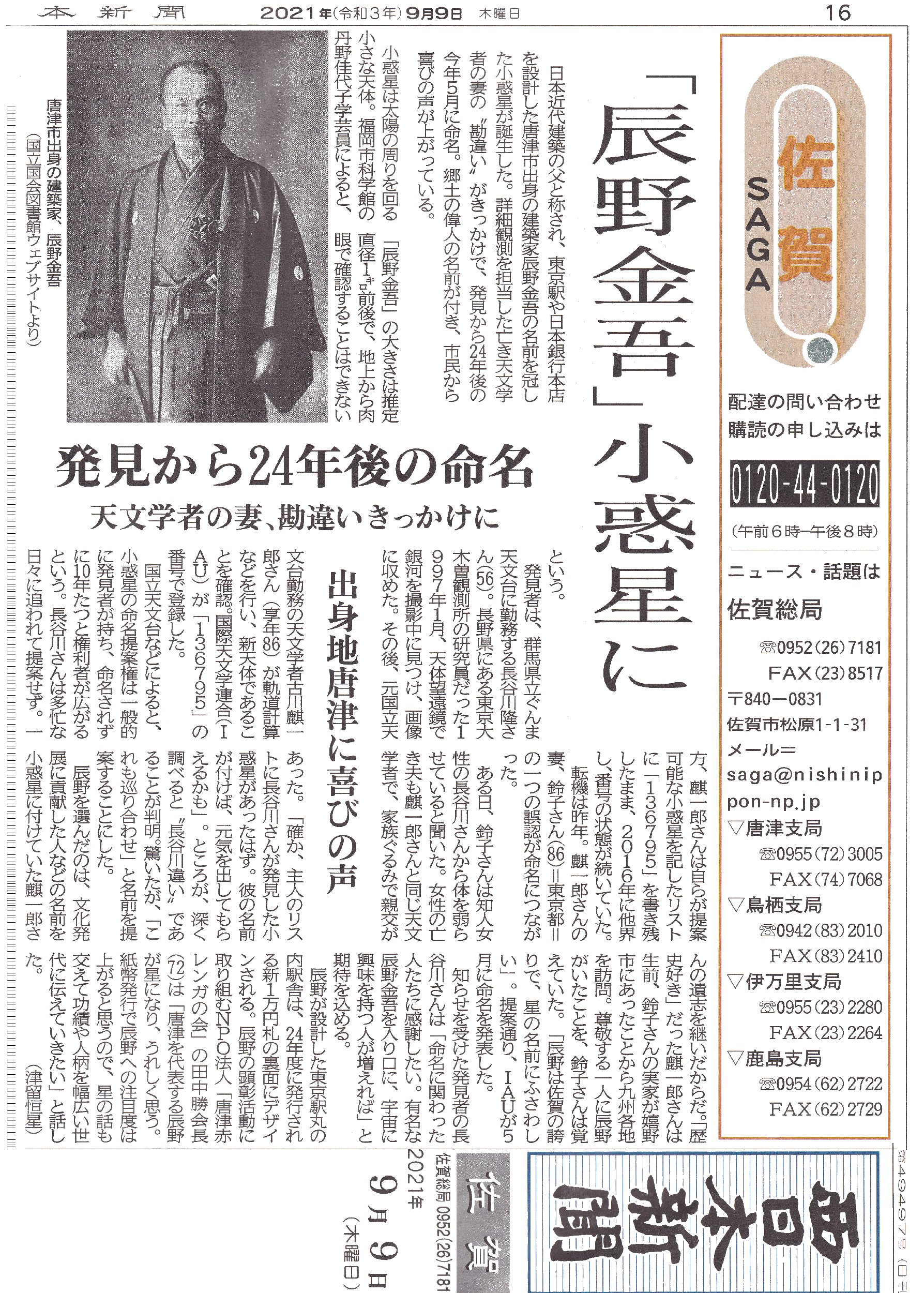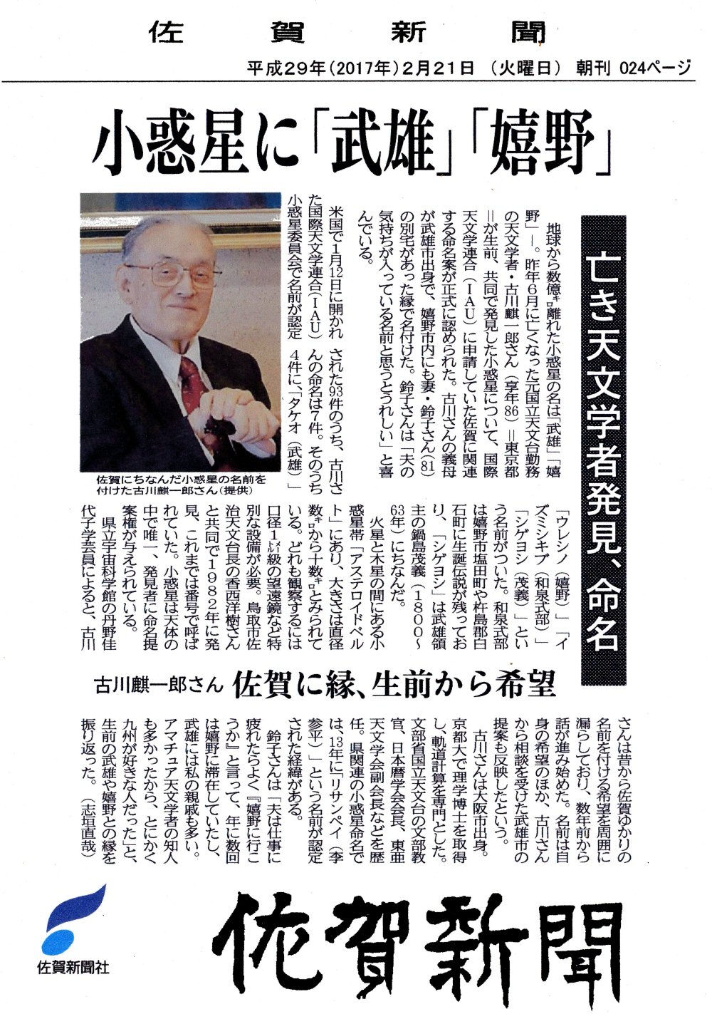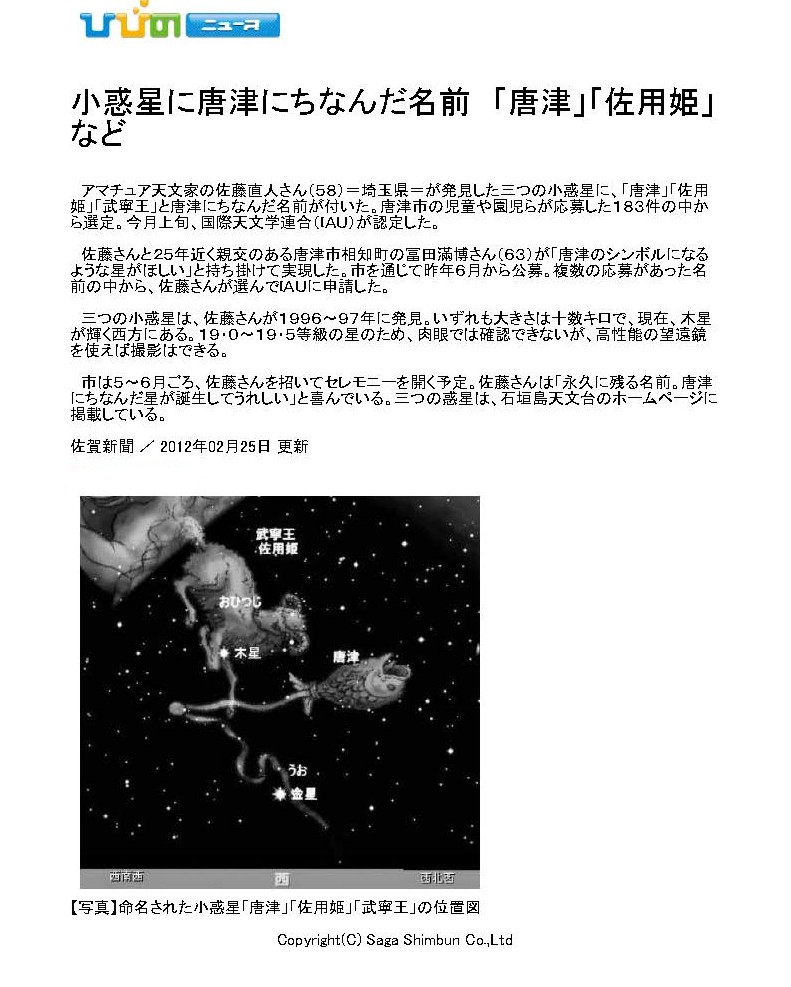 21 22394 Kondouakira 近藤昭/アマチュア天文家 1994TO 10月 2日 K.Endate and K.Watanabe 1 29514 Karatsu 唐津市/佐賀県に在する自治体名 1997YV6 12月25日 N.Sato 1 31095 Buneiou 武寧王/唐津市加唐島に生まれたとされる百済第25国王の名 1997DH 2月27日 N.Sato 32990 Sayo-hime 佐用姫/唐津市に伝わる松浦佐用姫の伝説による 1996YD3 12月30日 N.Sato 52260 Ureshino 嬉野市/佐賀県に在する自治体名 1982 KA 5月22日 H. Kosai and K. Hurukawa 1 1 52261 Izumishikibu 和泉式部/詩人。佐賀県で幼少時を過ごした。 1982 VL4 11月14日 H. Kosai and K. Hurukawa 1 136795 Tatsunokingo 辰野金吾/唐津出身、建築家、工学博士。 1997 BQ 1月16日 T. Hasegawa 1 24757 Kusano 草野敬紀/アマチュア天文家。 1992 VN 11月1日 Yanai, M., Watanabe, K. 48408 Yoshinogari 吉野ヶ里遺跡/吉野ヶ里町に弥生時代の遺跡。 1982 VN2 11月14日 Kosai, H., Hurukawa, K. 26808 Takeoroumon 武雄温泉楼門/武雄市にある国の重要文化財。 1982 VB4 11月14日 Kosai, H., Hurukawa, K. 以下、調べ中です。
