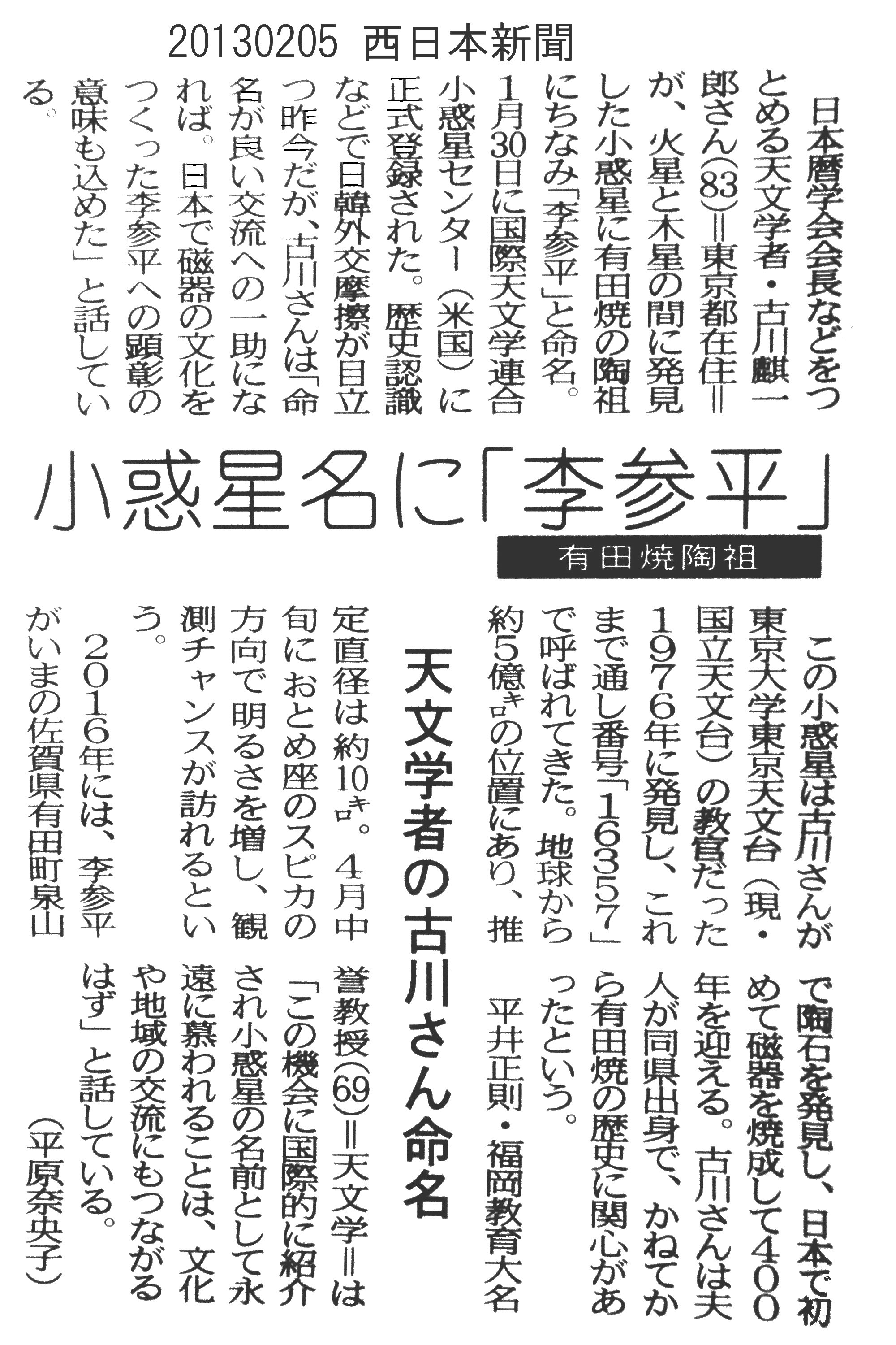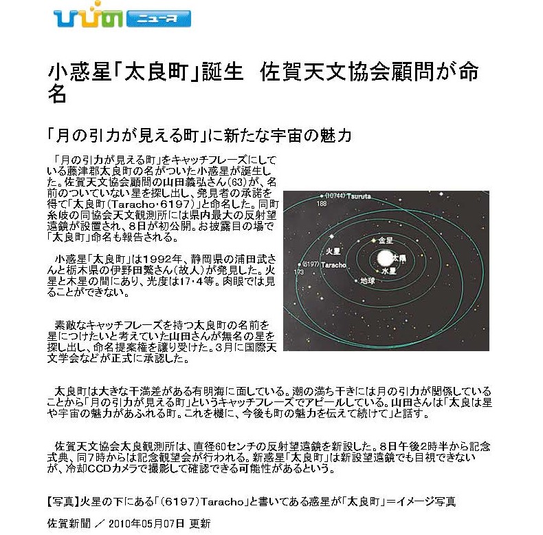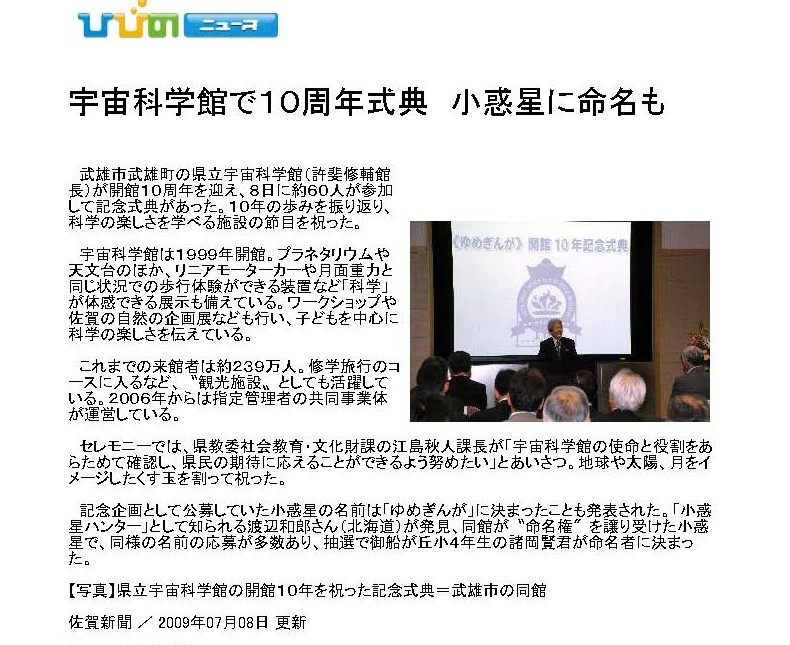 登録番号 小惑星名 由来. 仮符号 発見日 発見者 報道 映像 4998 Kabashima 椛島 冨士夫/アマチュア天文家 1986VG 11月5日 K.Suzuki and T.Urata 6197 Taracho 太良町 /佐賀県に在する自治体名 1992AB1 1月10日 伊野田 茂、浦田 武 1 7596 Yumi 弓(滋)/ 国際緯度観測事業 二代目中央局長 1993GH 4月10日 K.Endate and K.Watanabe 1 1 8274 Soejima 副島 勉/アマチュア天文家 1990TJ1 10月15日 K.Endate and K.Watanabe 9225 Daiki 松林 大樹/アマチュア天文家 1996AU 1月10日 T.Kobayashi 10744 Turuta 鶴田 政敏/アマチュア天文家 1998XO 12月5日 小島 卓雄 11099 Sonodamasaki 園田 正樹/アマチュア天文家 1995HL 4月20日 K.Endate and K.Watanabe 11324 Hayamizu 早水勉/アマチュア天文家 1995QQ3 8月30日 K.Endate and K.Watanabe 11593 Uchikawa 内川 義尚/アマチュア天文家 1995HK 4月20日 K.Endate and K.Watanabe 12411 Tannokayo 丹野 佳代子/天文教育普及家 1995SQ3 9月20日 K.Endate and K.Watanabe 1 12746 Yumeginga 佐賀県立宇宙科学館/開館10周年記念として公募で決定 1992WC1 11月16日 M.Yanai and K.Watanabe 1 14853 Shimokawa 下川洋司/アマチュア天文家 1989SX 9月30日 K.Endate and K.Watanabe 15351 Yamaguchimamoru 山口守/アマチュア天文家 1994VO6 11月4日 K.Endate and K.Watanabe 16357 Risanpei 李参平/有田焼の陶祖と称さている人物名 1976UP18 10月22日 H. Kosai and K. Hurukawa 1 1 19953 Takeo 武雄市/佐賀県に在する自治体名 1982 VU2 11月14日 H. Kosai and K. Hurukawa 1 1 19954 Shigeyoshi 鍋島茂義/武雄鍋島家 第28代領主 1982 VY3 11月14日 H. Kosai and K. Hurukawa 1