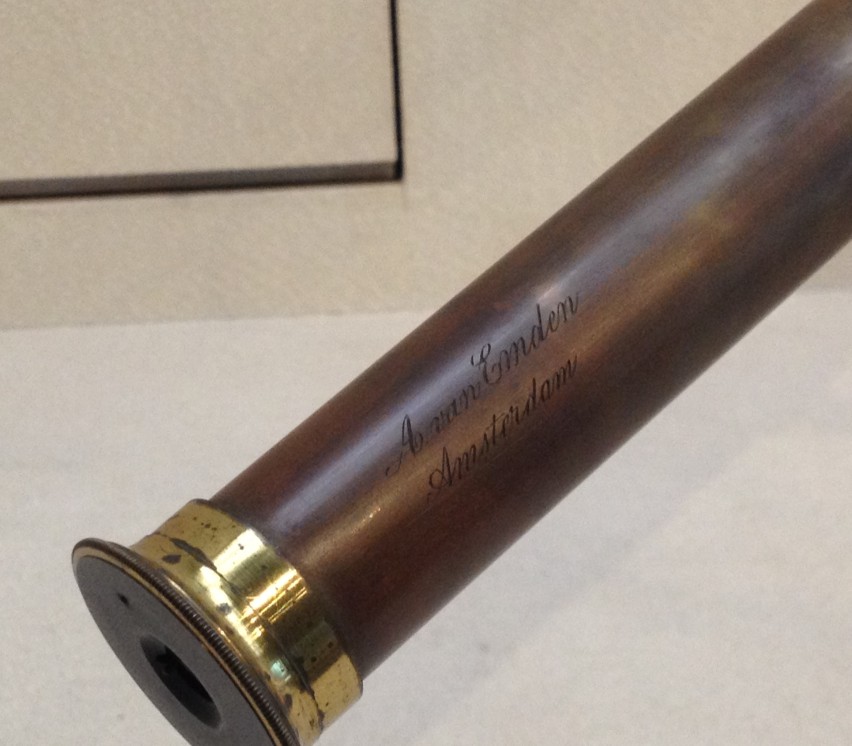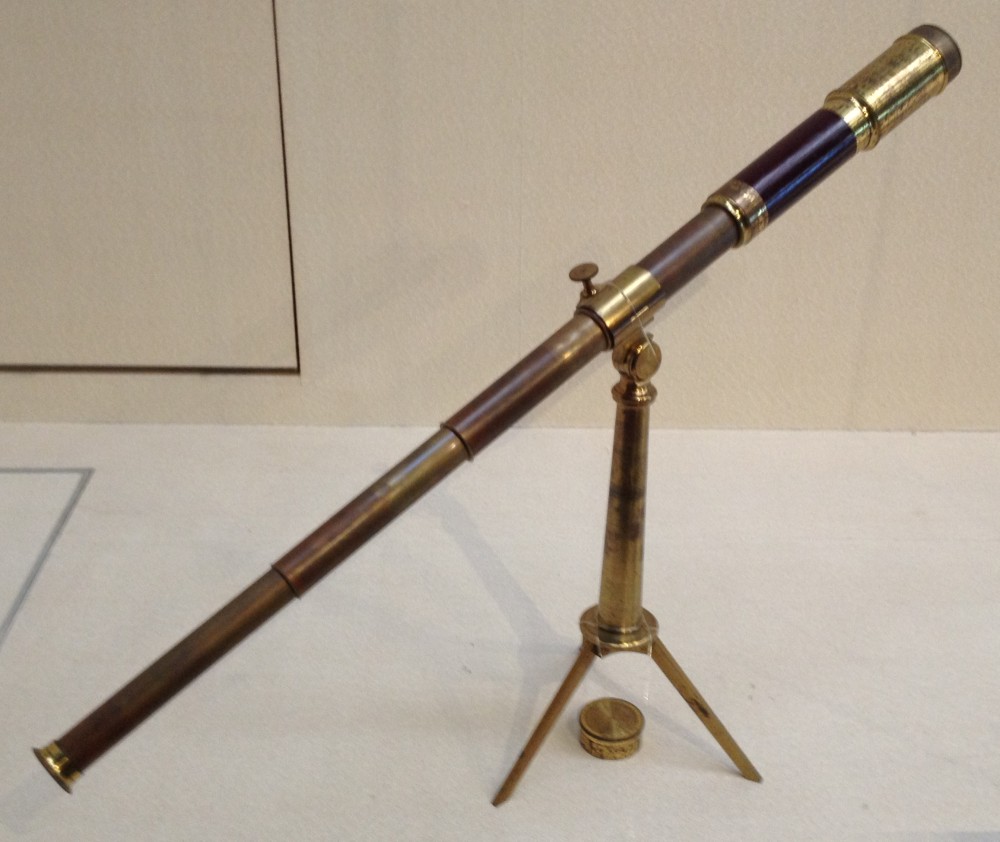 屈折式望遠鏡で、鏡筒は黄銅製の4段に伸縮し、三脚は折りたたんで収納できます。卓上型地上望遠鏡として製作されたものですが、月、惑星などの天体観測用としても用いられます。当時のヨーロッパ製屈折望遠鏡には色消しレンズが用いられ、単玉の国産望遠鏡と比べると色収差による像のにじみがなく、解像力にもすぐれています。